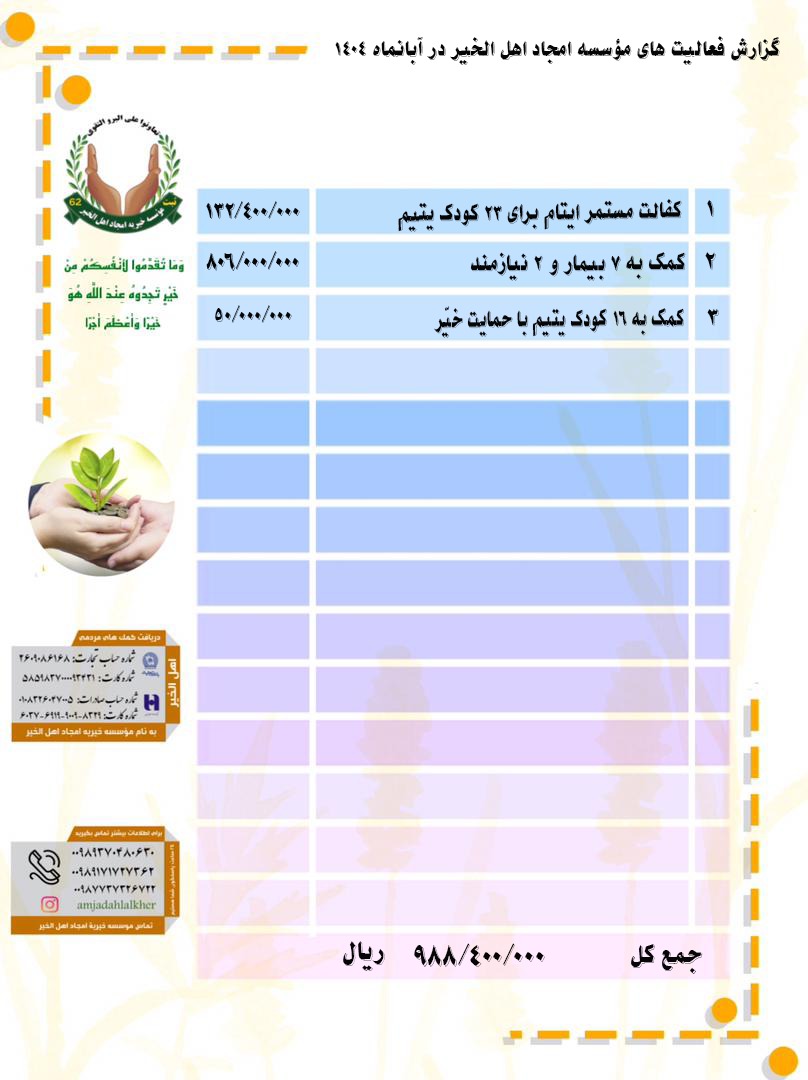 ۱- با حمایت خیّرین (کفالت مستمر ایتام) به مبلغ یکصد و سی و دو میلیون و چهارصد هزار ( ۱۳۲/۴۰۰/۰۰۰ ) ریال به ۲۳ کودک یتیم کمک شد .